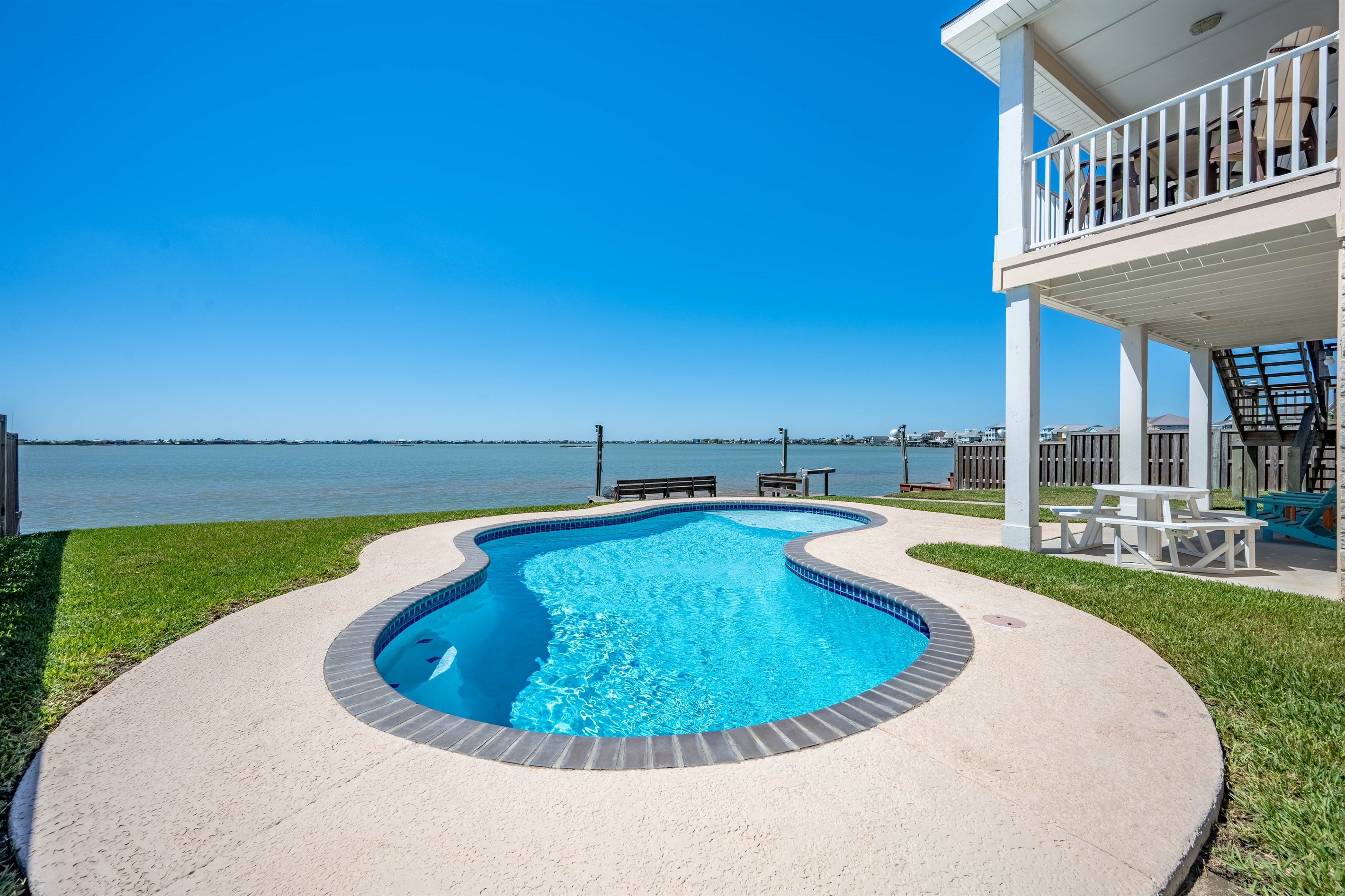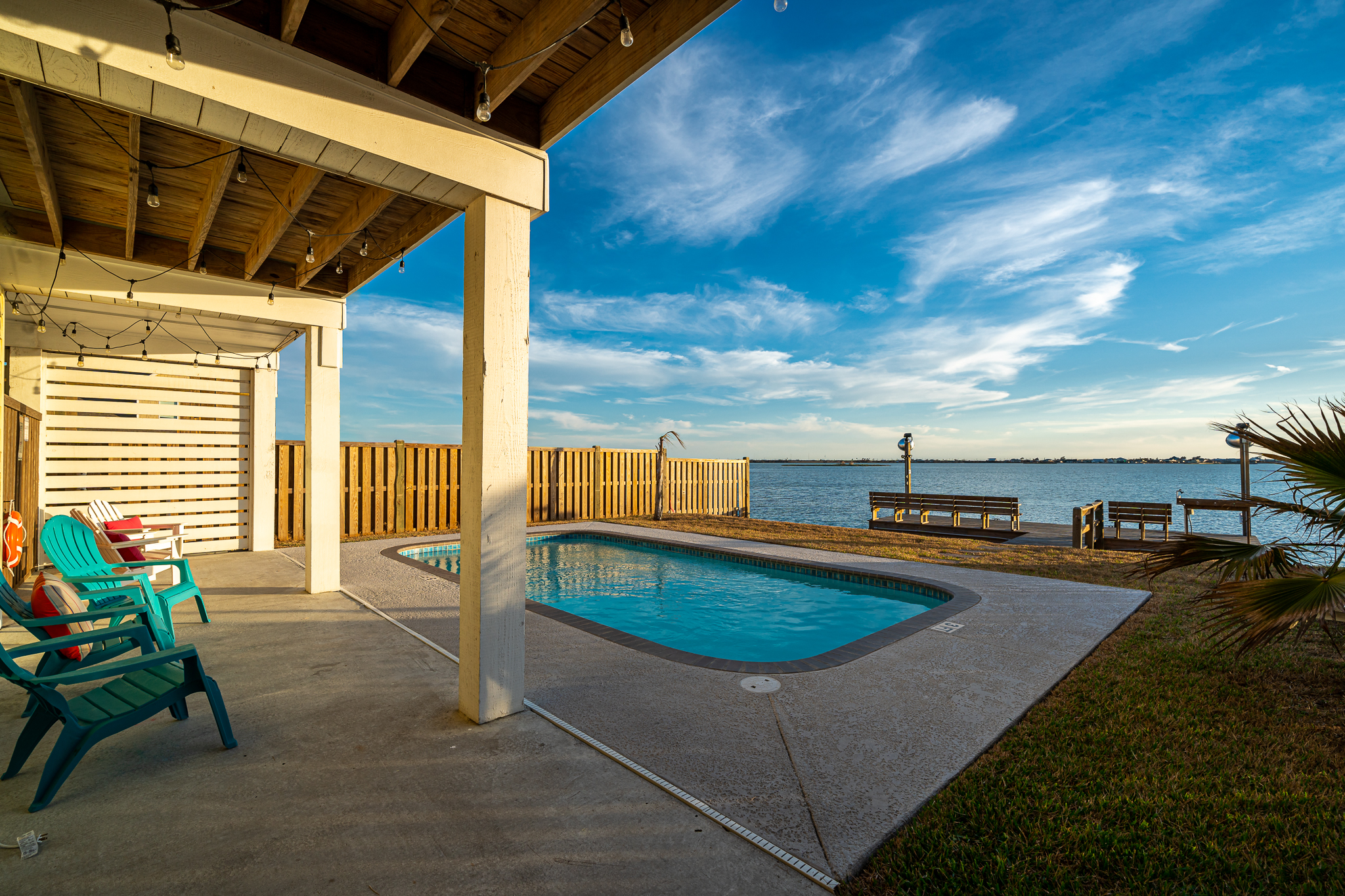 Gorgeous vacation home on Salt Lake with heated private pool, lighted fishing pier, platform for easy kayak launching.
