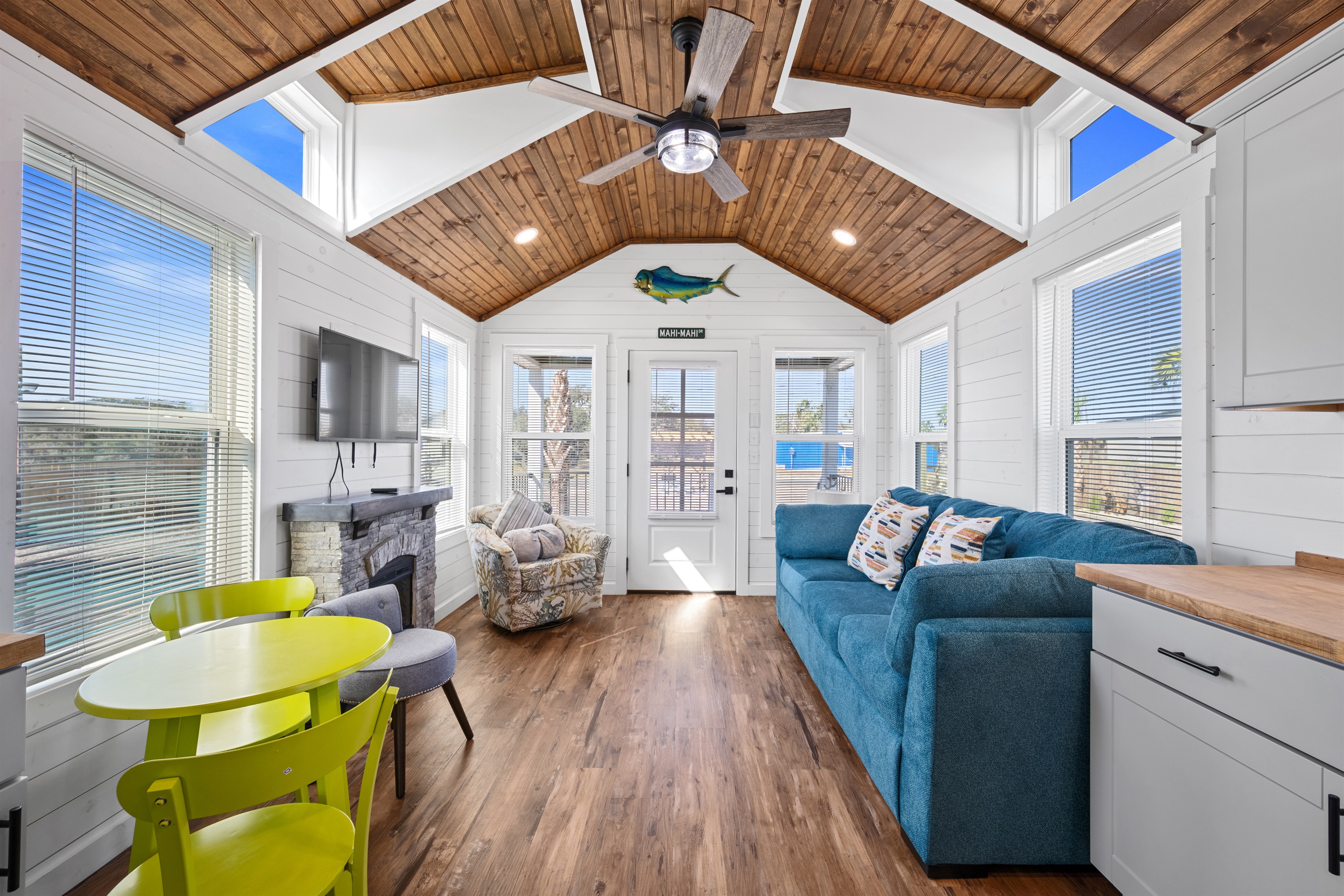 Blue Haven is a waterfront 4 bedroom/3 bath home with a heated pool, private fishing pier, 2 kayaks, and ample parking. The open-concept living area features a fully equipped kitchen, dining area, and comfortable seating. The home includes two primary bedrooms with king beds, a queen bedroom, a "kids room" with a trundle bed, and three bathrooms. Ideal for family or friends, it offers a relaxing retreat with lots of amenities.