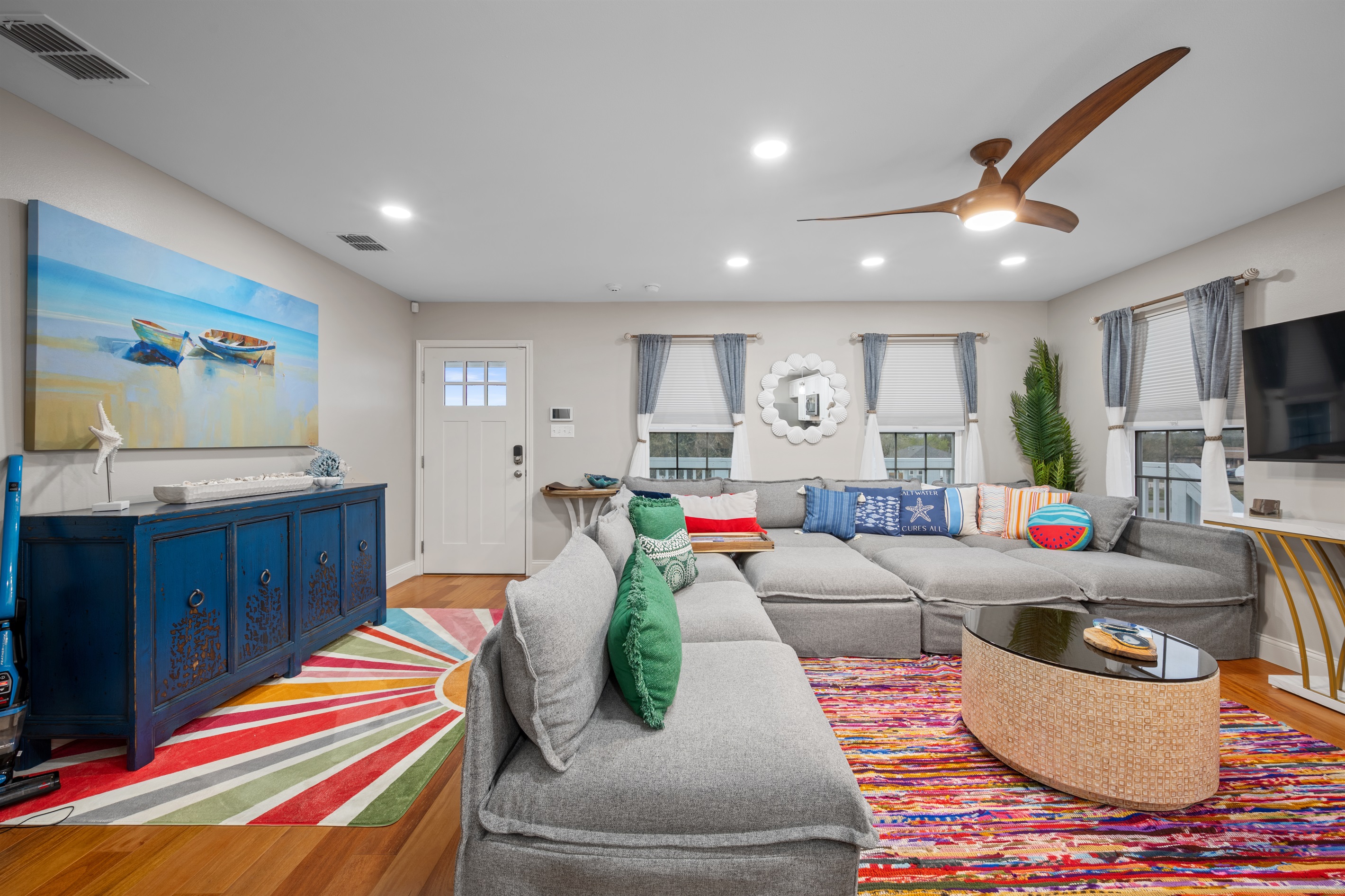 Recently renovated home a 1/3-mile walk to Water St. along Aransas Bay. It sleeps up to 6 guests and offers 2 bedrooms, 2 bathrooms, a loft, boat parking, and two Huffy Bikes. The home is situated near downtown Rockport and popular spots like Rockport Beach. It comprises a fully equipped kitchen, living area, main bedroom with ensuite, second bedroom, loft with two queen beds, and an additional full bathroom. Guests can enjoy beach necessities, bikes, and parking for a boat trailer.