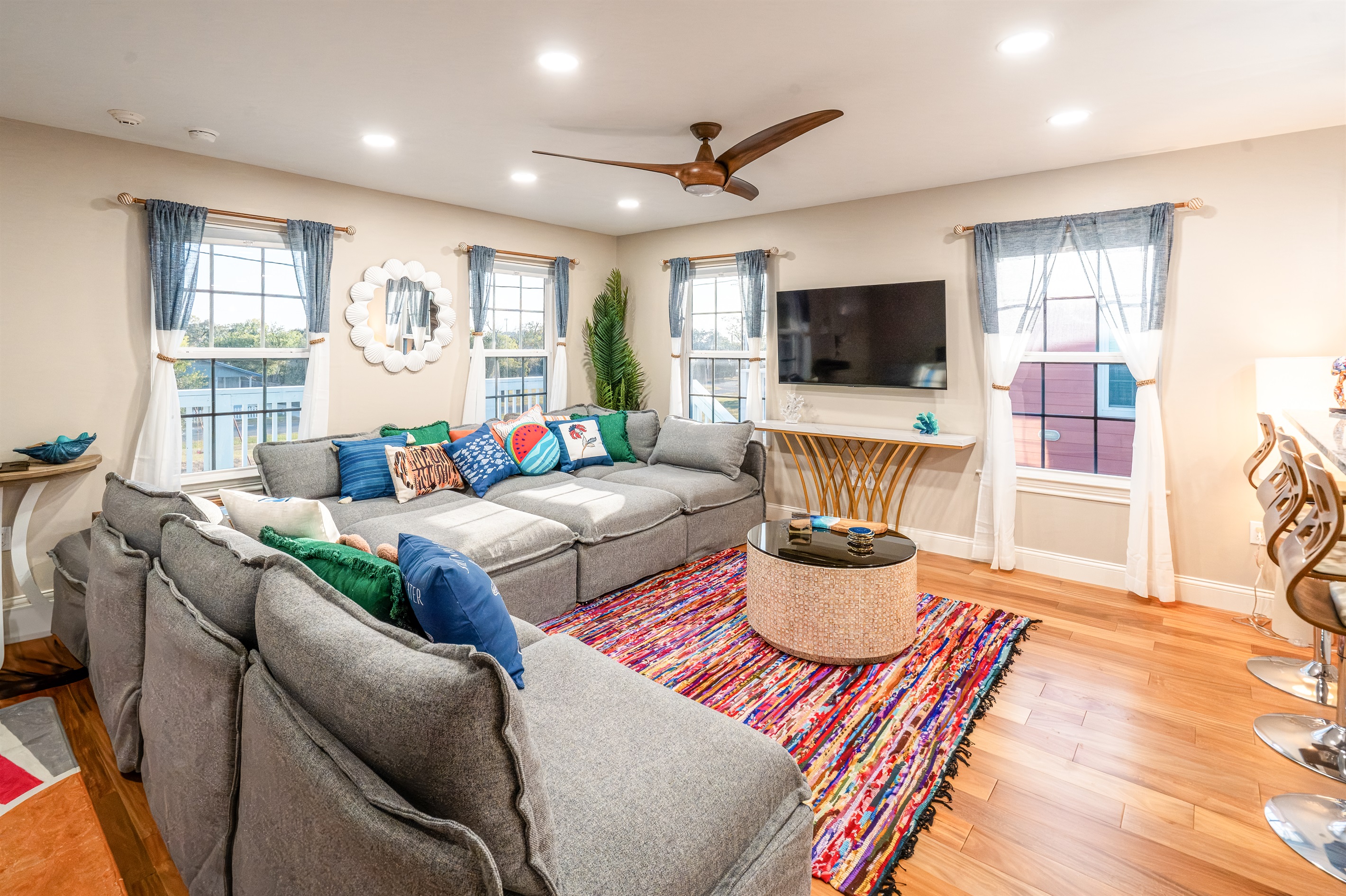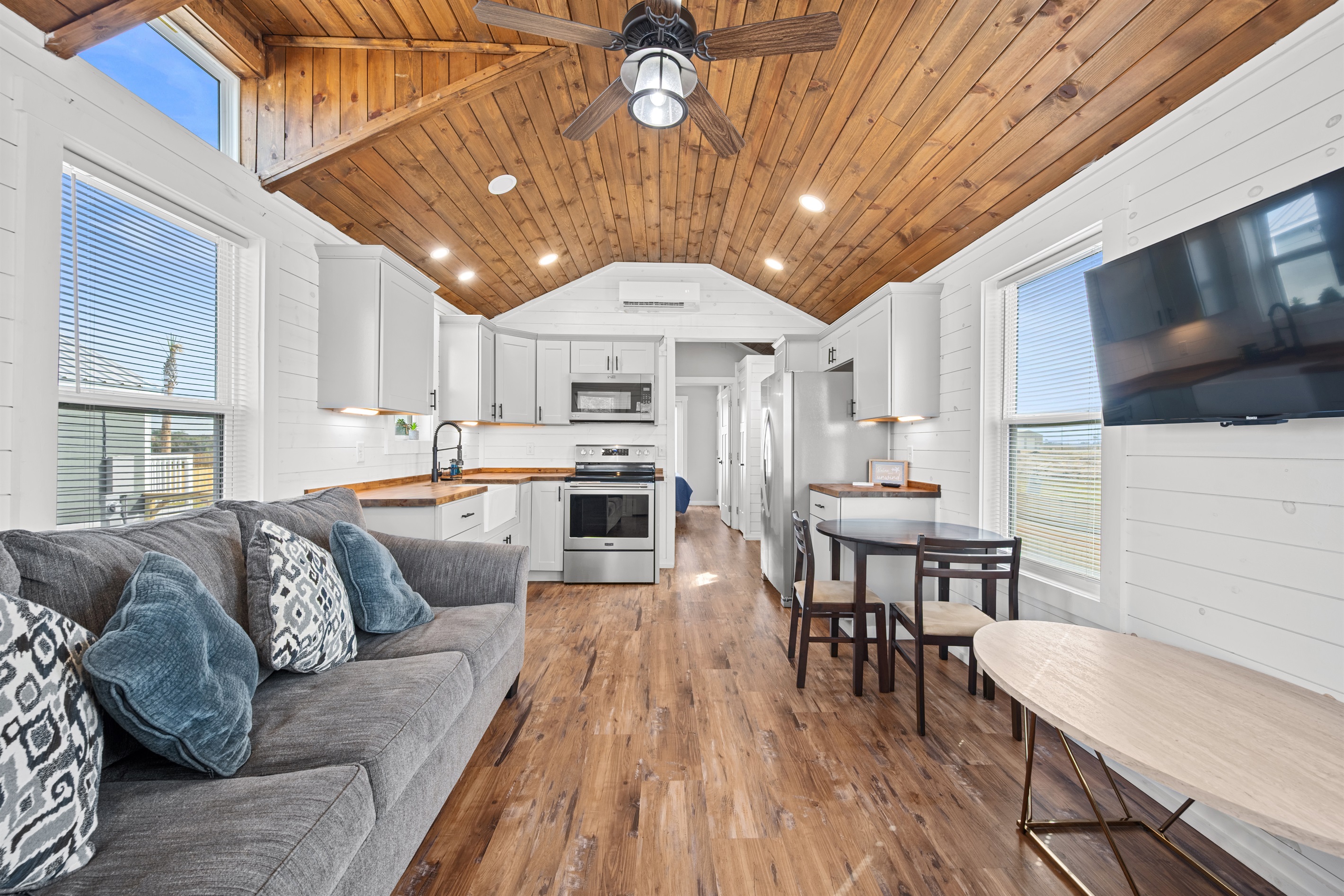 Open concept with a fully equipped kitchen, island seating, dining table, large living area w/ huge TV. Primary bedroom w/ king bed, en-suite bathroom w/ dual vanity & large shower. Two guest bedrooms w/ queen beds and a full bathroom. The living room couch is also a queen sleeper sofa.