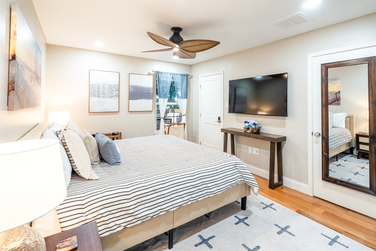 The home accommodates up to 8 guests. The primary bedroom features a king bed and an ensuite bathroom. Two additional guest rooms each have a queen bed, and the living room includes a queen-size sleeper sofa. A second full bathroom ensures space and comfort for everyone.