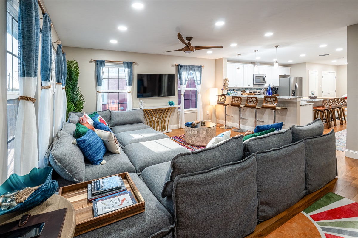 Downstairs is an entertainer’s paradise—featuring a fully equipped outdoor kitchen with a full-size refrigerator, XL deep freezer, two griddles, a 2-basket deep fryer, sink, prep table, and a 65” outdoor TV. LED cube lights provide ambient lighting (and extra seating), and there's plenty of space to lounge with two large sectionals, a wood bench, and two coffee tables.