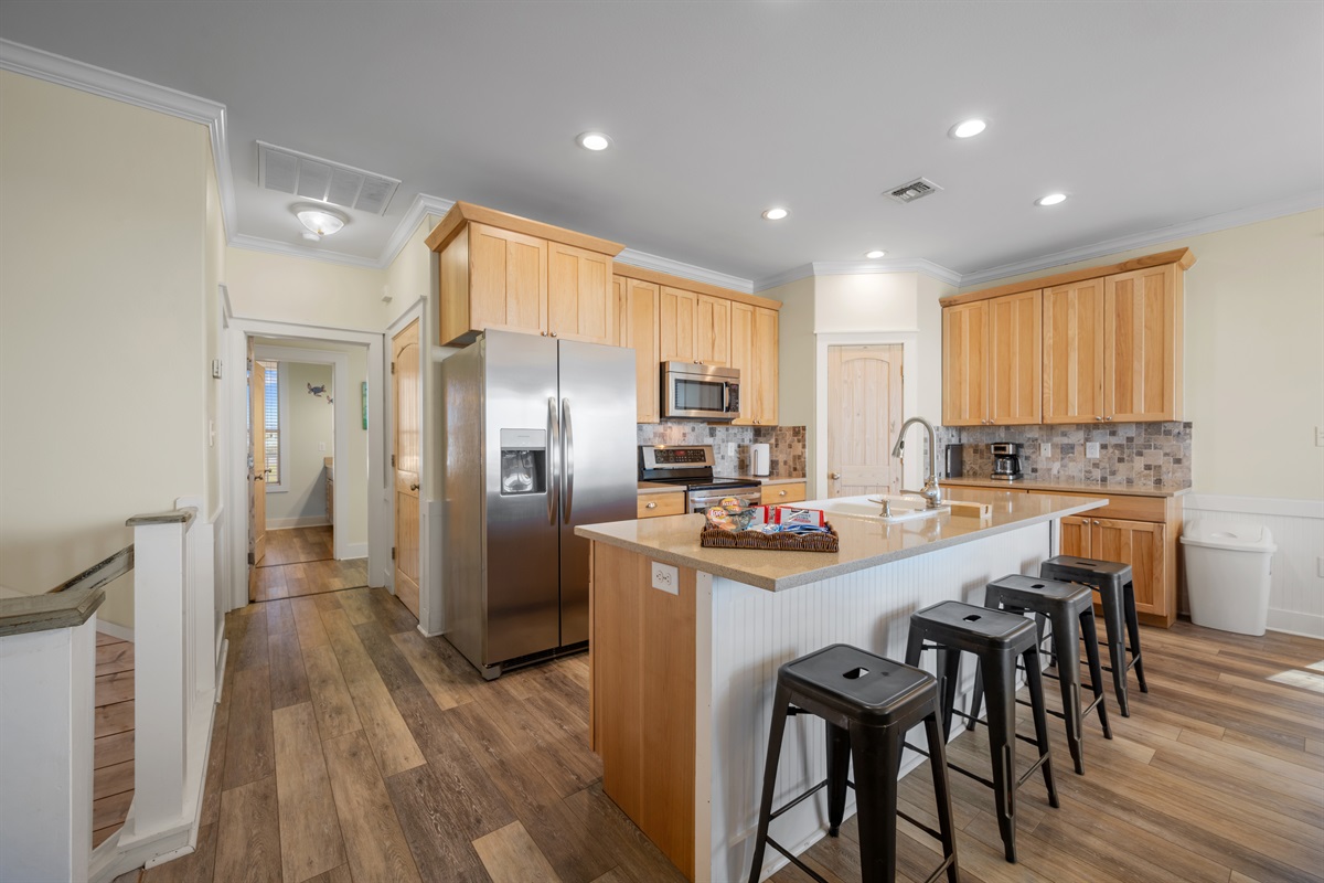 • Kitchen island + barstools for breakfast, snacks, and happy hour