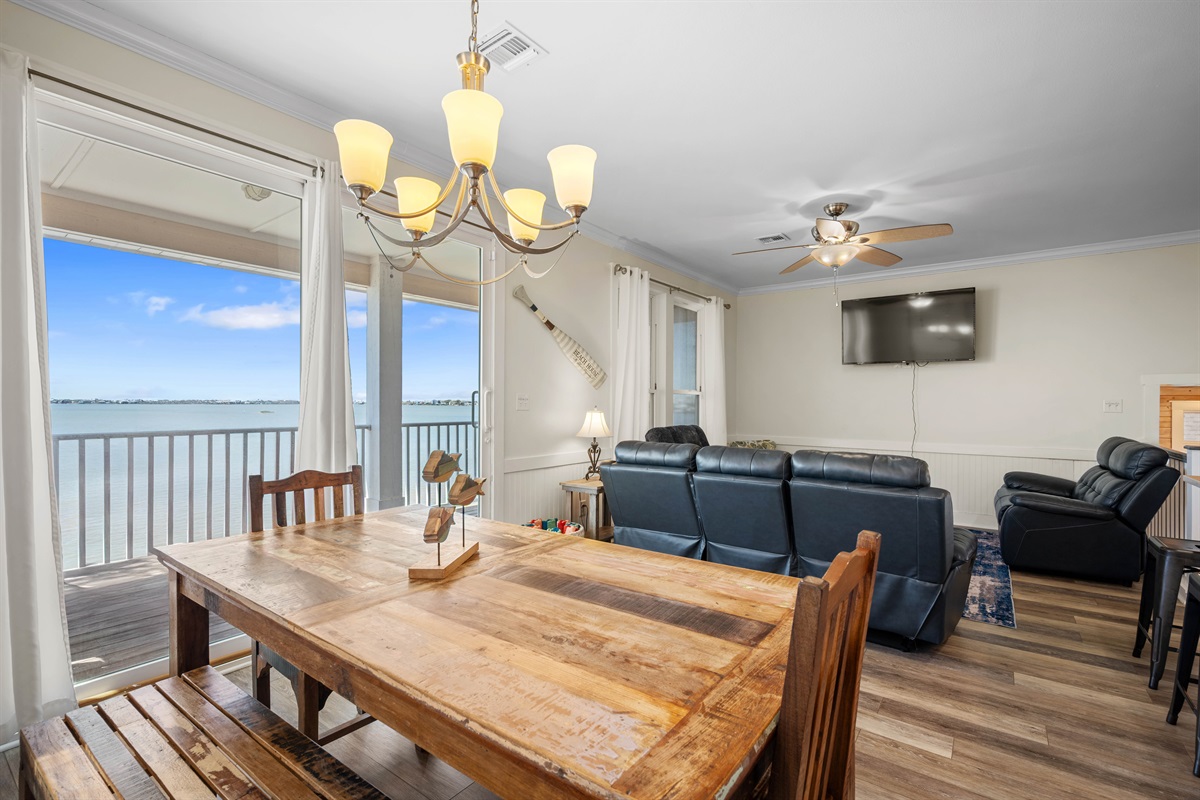 • Open-concept living: fully equipped kitchen, dining area, and living room overlooking the water