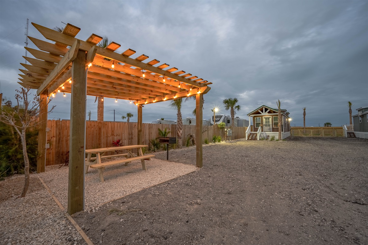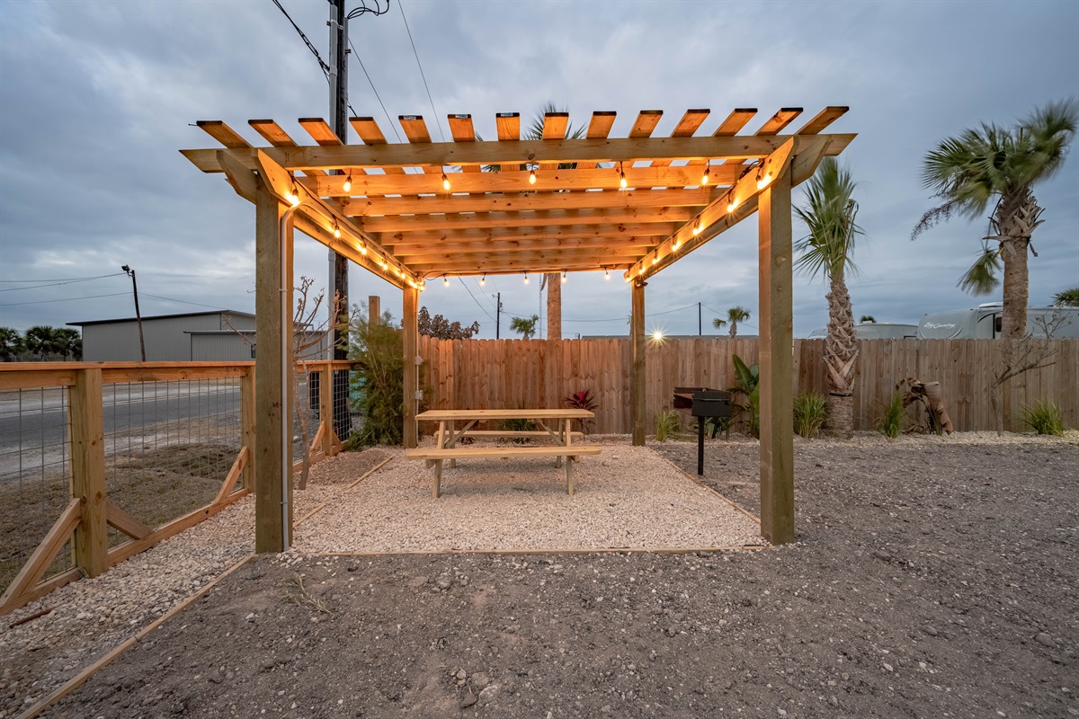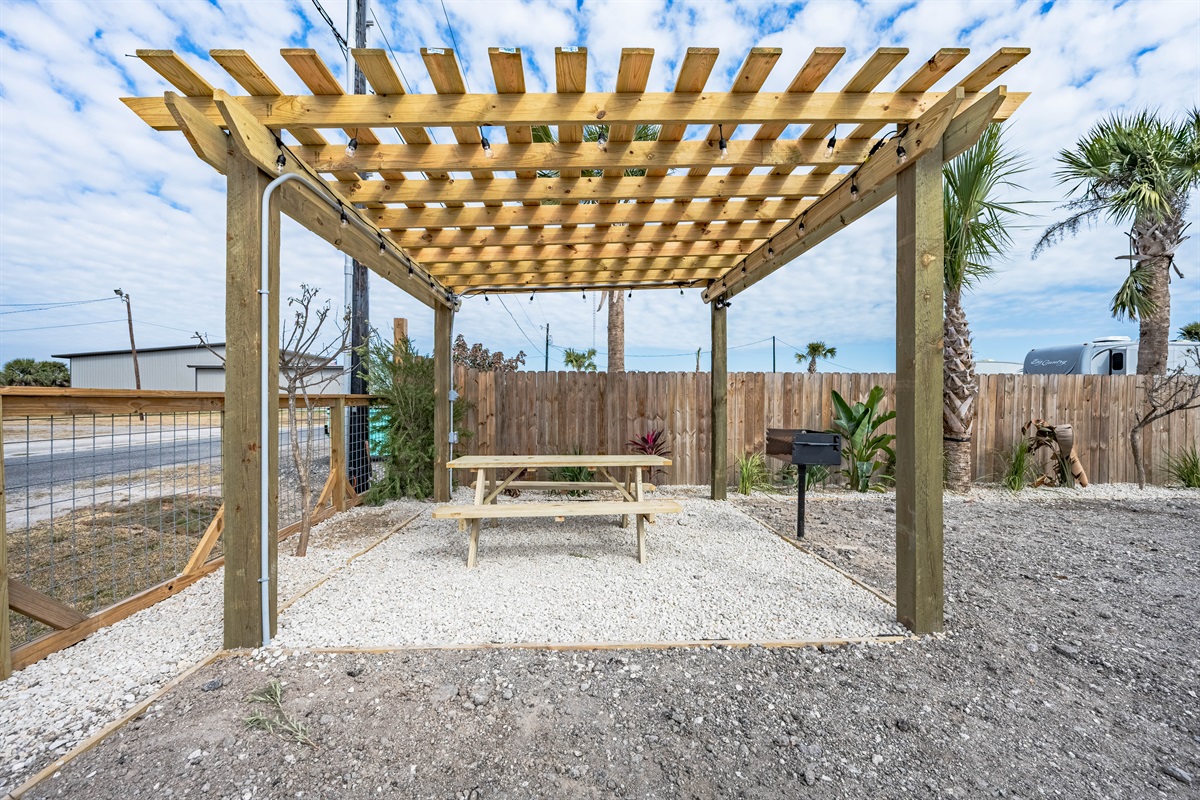 • Private pergola with string lights, charcoal grill & picnic table