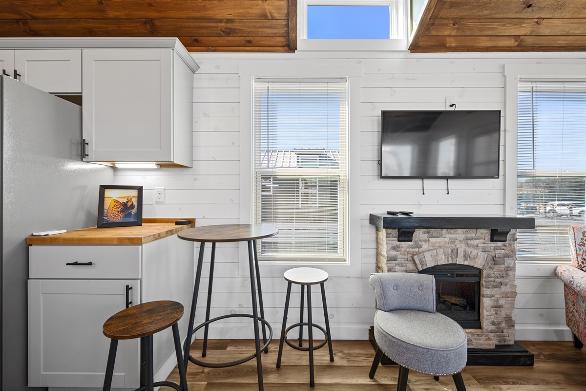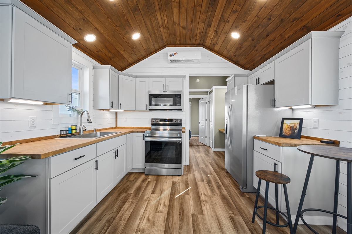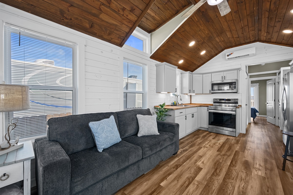 Inside, the home features a bright, open layout with vaulted ceilings, a comfortable living area, and smart TVs in both the living room and bedroom. The full kitchen is equipped for preparing meals, and the full bathroom includes a stand-up shower with clean, modern finishes.