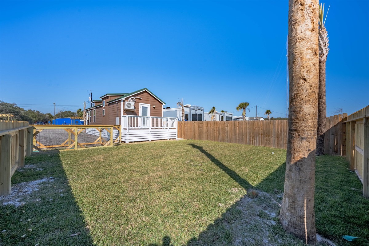 Outside, enjoy your own private pergola with string lights, a charcoal grill, and a picnic table—perfect for grilling your catch of the day or winding down in the evenings. You’ll also have back patio seating and a fully fenced backyard, making this home especially convenient for guests traveling with pets.