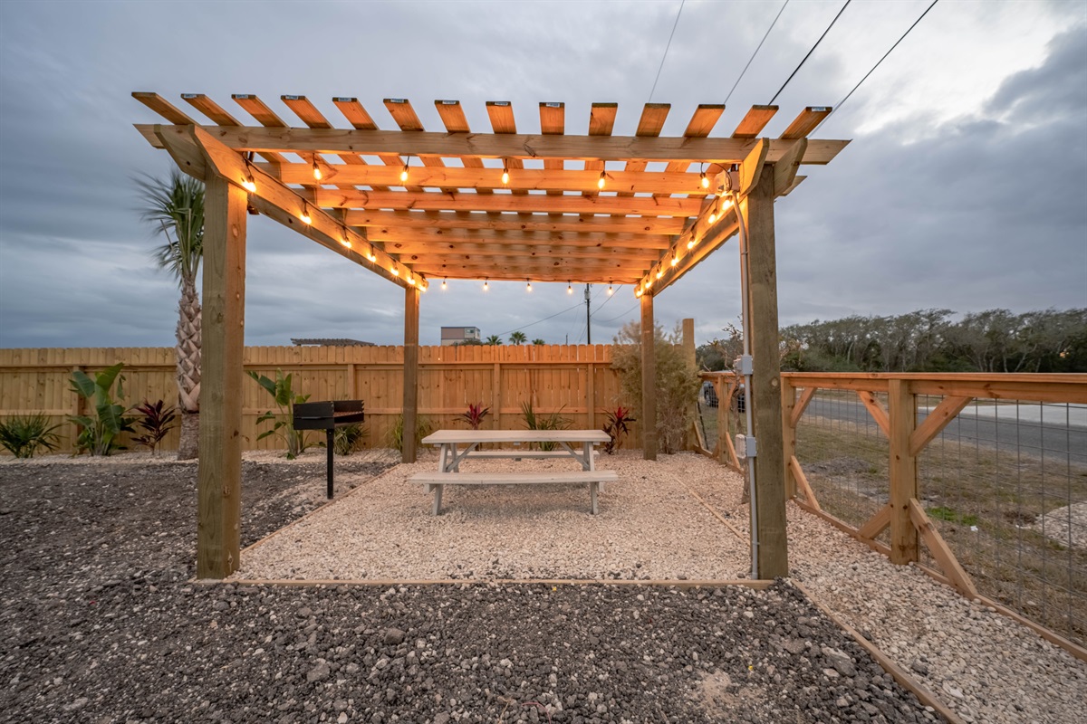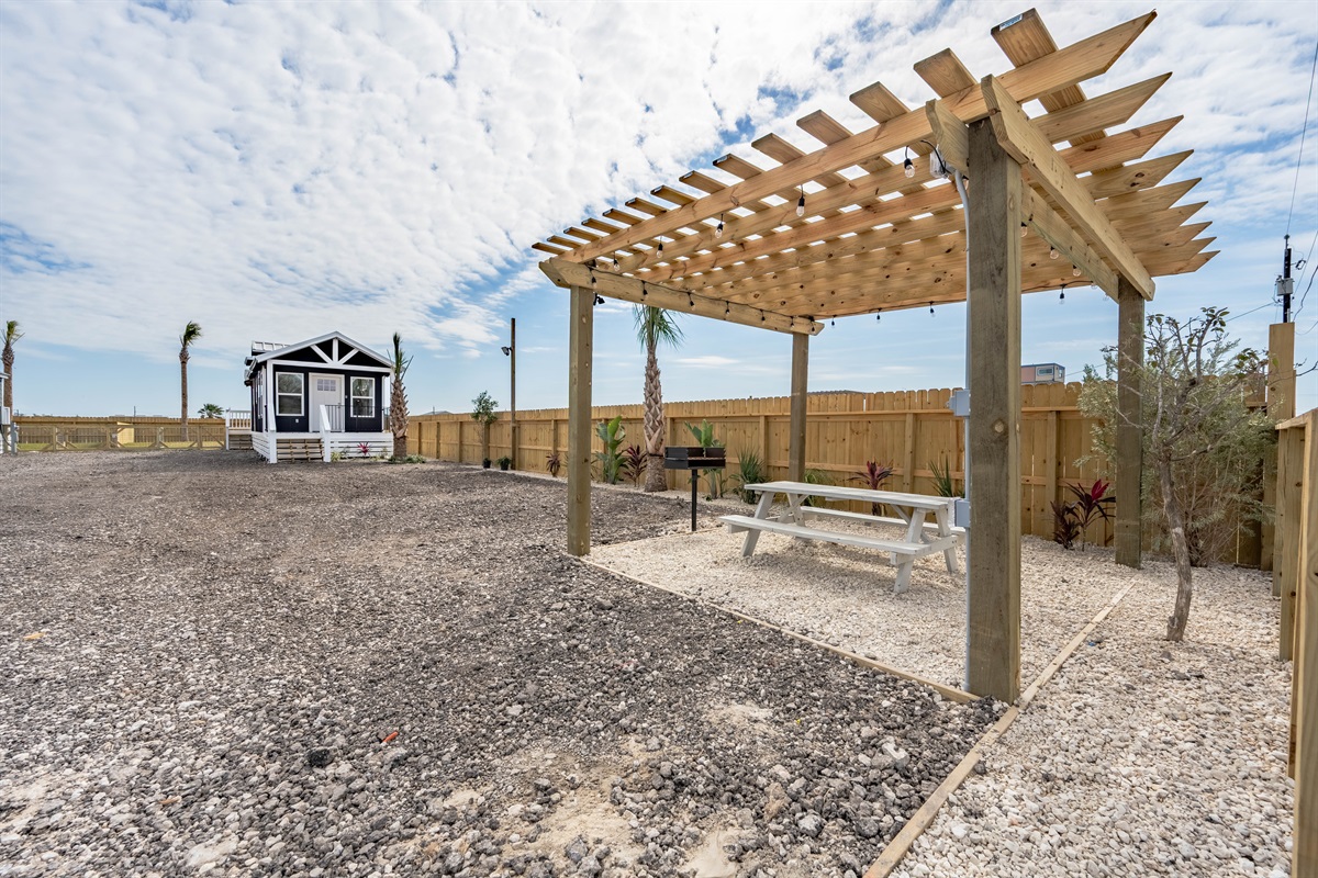Outside, enjoy your own private pergola with string lights, a charcoal grill, and a picnic table—perfect for grilling your catch of the day or winding down in the evenings. You’ll also have back patio seating and a fully fenced backyard, making this home especially convenient for guests traveling with pets.