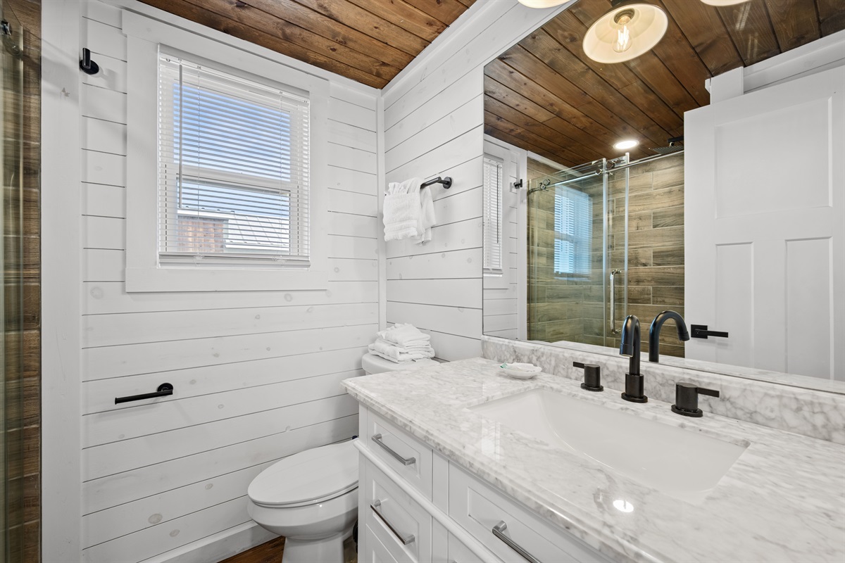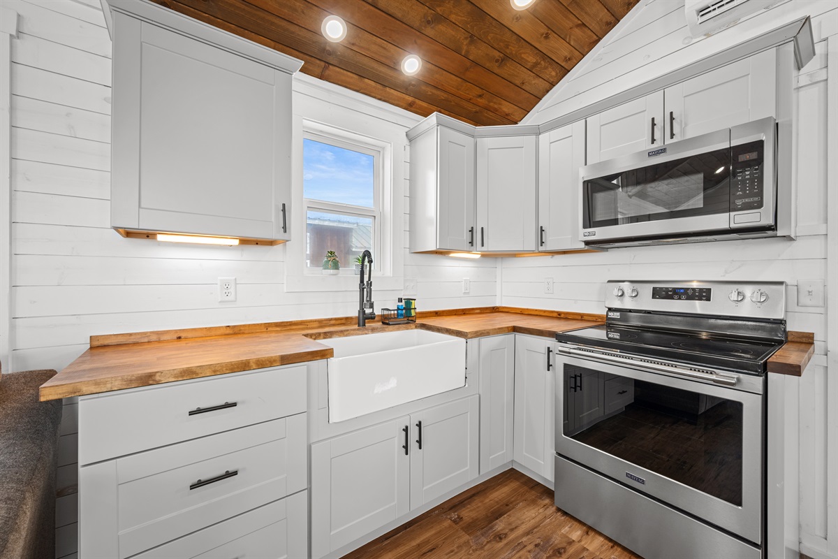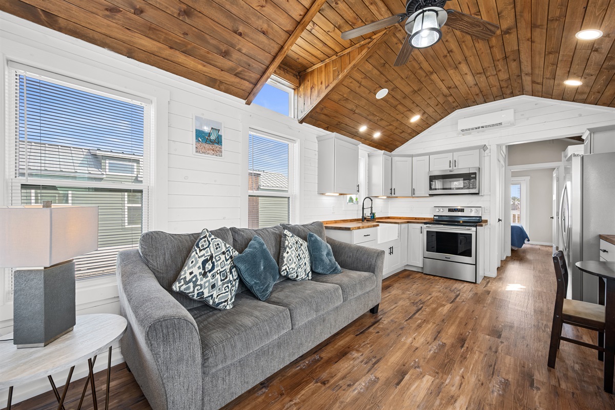 Inside, the home features a bright, open layout with vaulted ceilings, a comfortable living area, and smart TVs in both the living room and bedroom. The full kitchen is equipped for preparing meals, and the full bathroom includes a stand-up shower with clean, modern finishes.